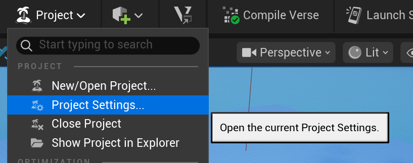 変換したいプロジェクトを UEFN で開き、上部メニューから [Menu (メニュー)] > [Project (プロジェクト)] > [Project Settings (プロジェクト設定)] を選択します。