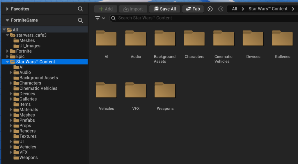 再起動が完了すると、[Content Browser (コンテンツ ブラウザ)] 内に、選択したブランド専用のゲーム機能セットやアセットが表示されるようになります。
