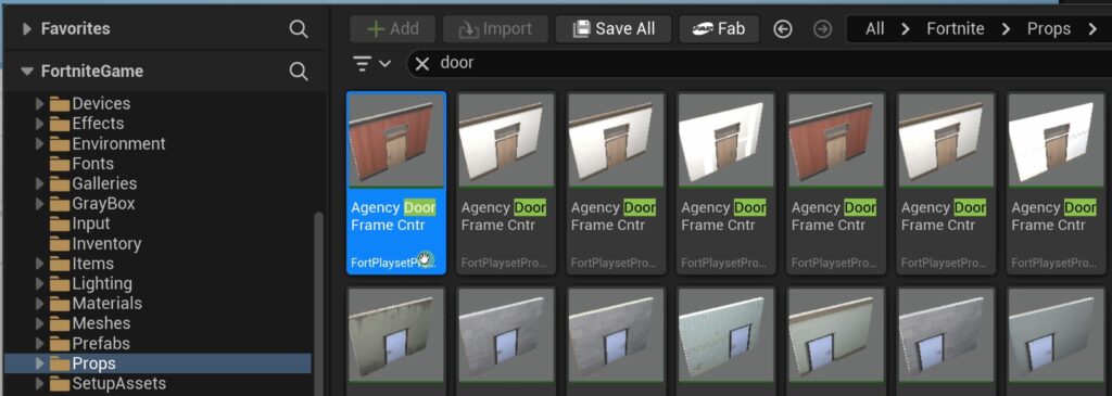 コンテンツブラウザからLock Device(ロックの仕掛け)と、ドア付きのオブジェクト(例:Agency Door Frameなど)を配置します。