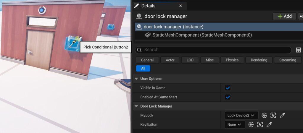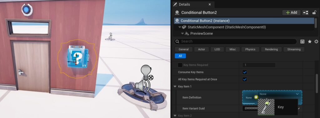 今回実装するのは、Conditional Button(条件付きボタンの仕掛け)で特定のアイテム(鍵など)を消費し、Lock Device(ロックの仕掛け)で施錠されたドアを開けるというゲームロジックです。