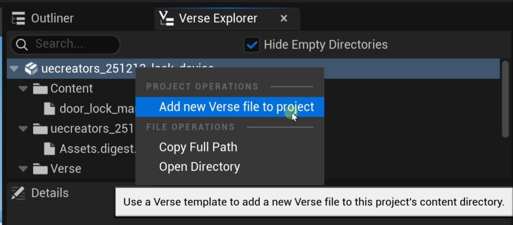 Verse Explorerから新しいVerseファイルを作成します。今回はクラス名を door_lock_manager としました。