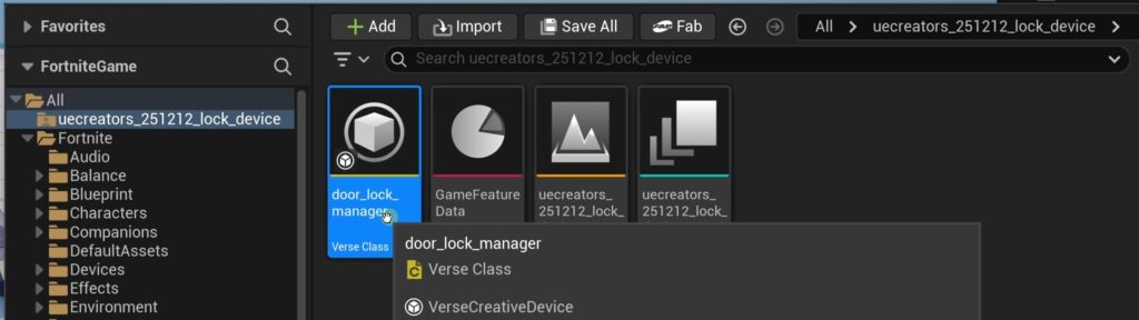 こんにちは、UEクリエイターズです。今回もUEFN(Unreal Editor for Fortnite)の使い方について解説していきます。この記事では、Lock Device(ロックの仕掛け)を使ったドアのロック制御とVerse連携について具体的に説明していきます。