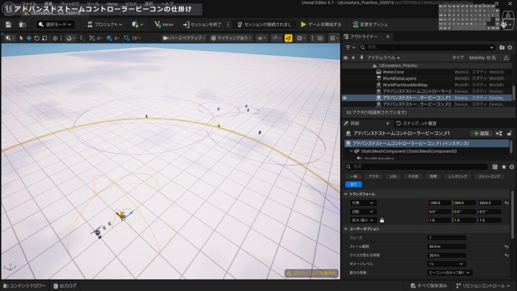 アドバンスドストームコントローラーを親として、レベル上に複数のビーコンを配置し、各ビーコンにフェーズを設定することで、ストームが移動する位置を自由に指定できます。これにより、特定の場所にストームを誘導したり、プレイヤーを特定のエリアに閉じ込めたりといった演出が可能になります。