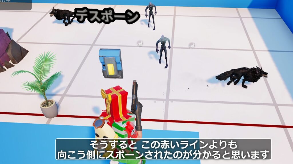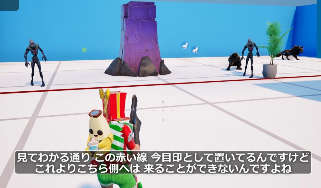 AIナビゲーション変更の仕掛けを設定したエリアの内側には、AIキャラクターが侵入できなくなります。これにより、プレイヤーはAIから安全な領域を確保することができます。