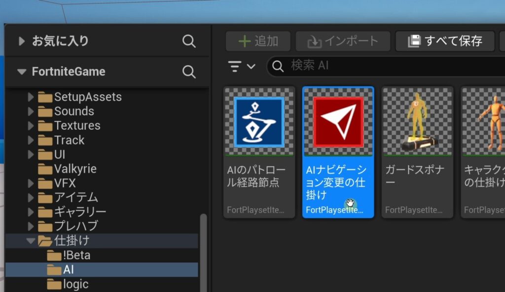 AIの項目には「ガードスポナー」という仕掛けもあります。本来であればAIナビゲーション変更の仕掛けに対応するはずですが、UEFNの動作状況によってはガードが壁を飛び越えてくるなどの不安定な挙動を示す場合があります。導入する際は、事前にテストプレイで動作が安定しているか確認することをおすすめします。