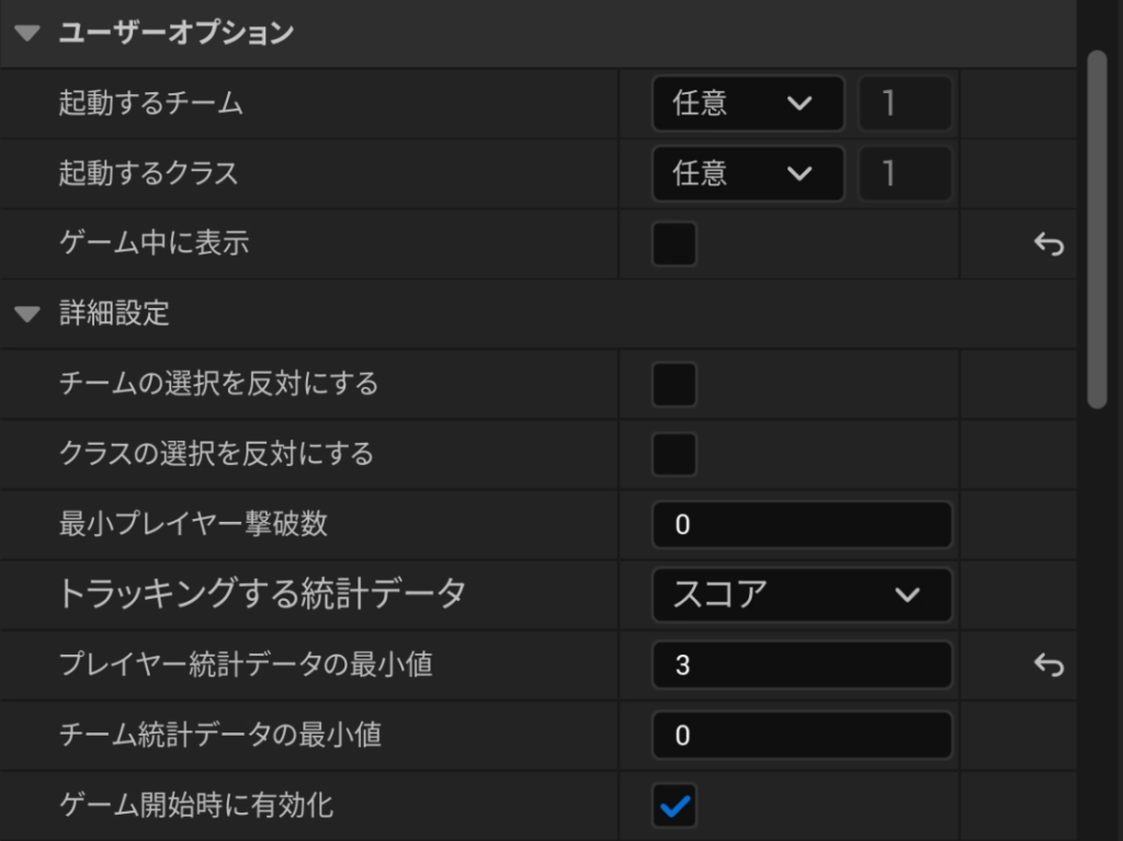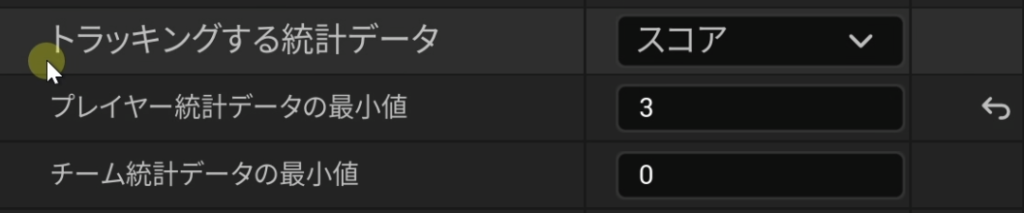 「プレイヤー統計データの最小値」を設定します。動画の例では「3」に設定し、スコアが3以上で成功となるようにしています。
