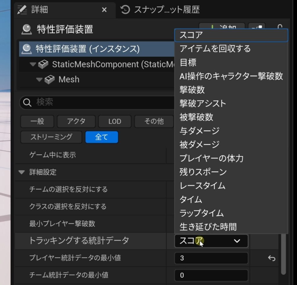例えば、プレイヤーのスコア状況、アイテムの回収数、AIキャラクターの撃破数などを評価基準に設定できます。