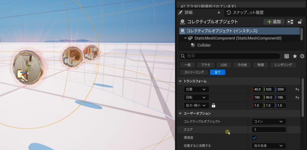 コレクティブルオブジェクトはデフォルトでスコアが1加算されるように設定されています。これを複数配置することで、目標スコアに到達させることができます。動画では3つ配置し、合計スコアが3になるようにしています。