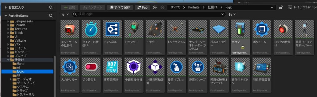 - コンテンツブラウザの「仕掛け」>「ロジック」から「ボタン」をレベル上に配置します。