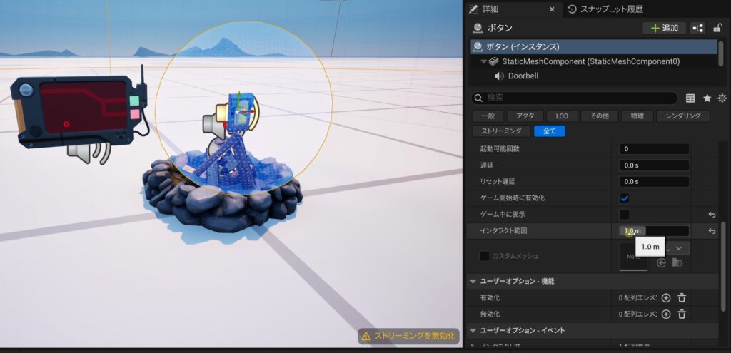 - ボタンデバイスを選択し、詳細パネルの「ユーザーオプション」で「ゲーム中に表示」をオフ、「インタラクト範囲」を1mなどに設定します。