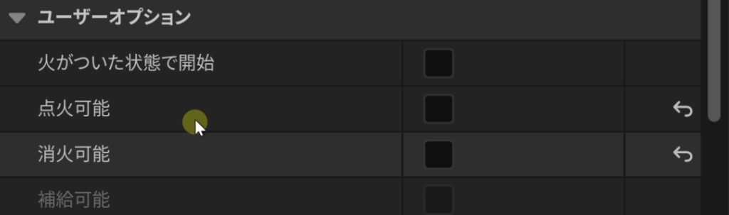 - 焚き火の仕掛けを選択し、詳細パネルの「ユーザーオプション」で「点火可能」と「消火可能」を「False」に設定します。これにより、プレイヤーが直接焚き火を操作できないようにします。