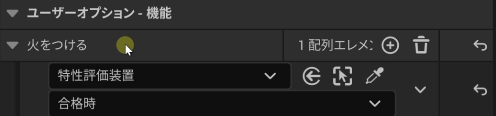 - 焚き火の仕掛けを選択したまま、詳細パネルの「ユーザーオプション」>「機能」にある「火をつける」の横にある「要素を追加」ボタンをクリックします。