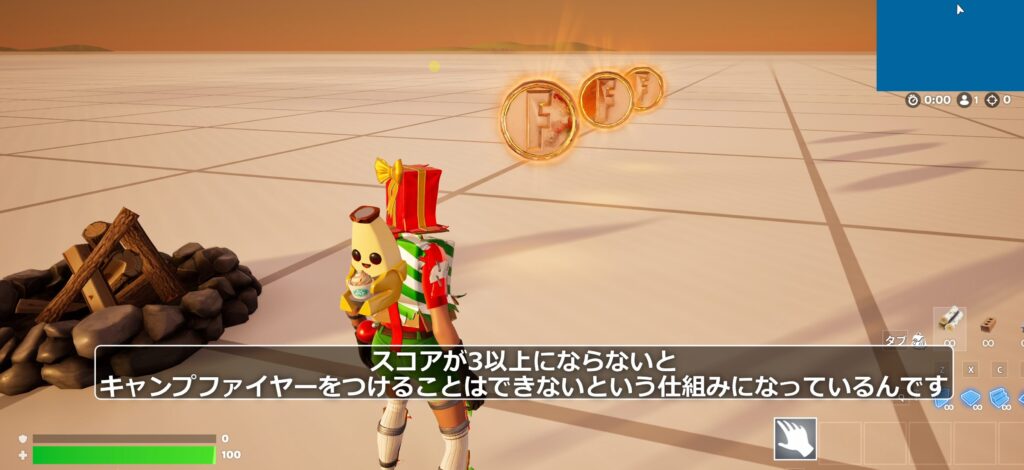 動画では、焚き火に火をつけるために特定の数のコインを回収するという仕組みを例に、その動作を解説しています。