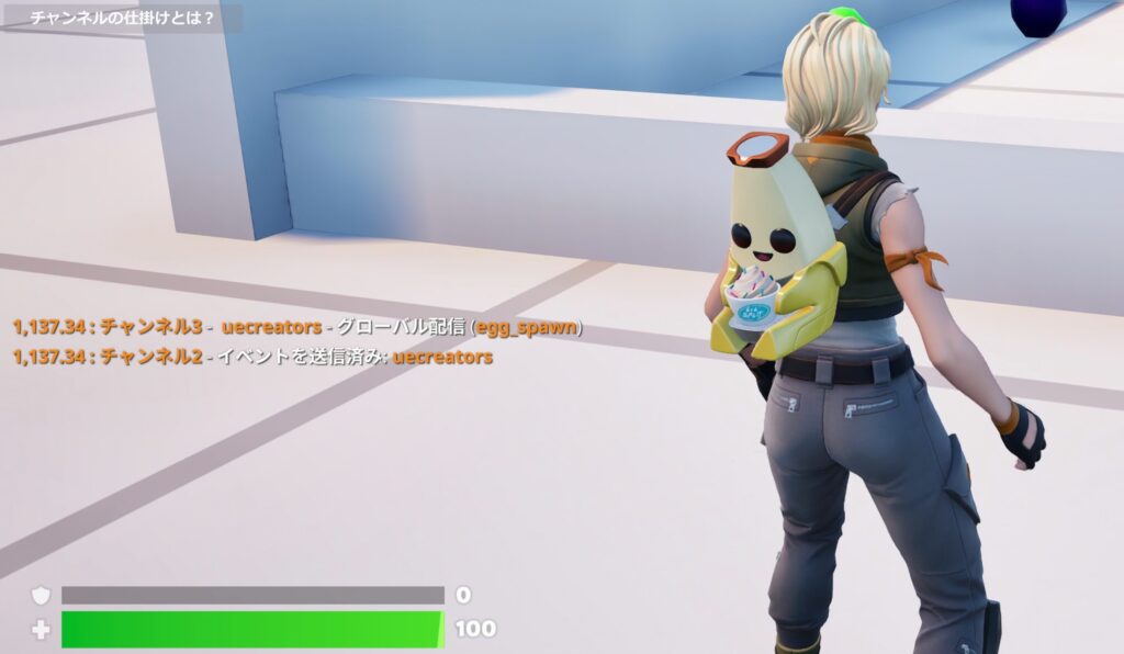 チャンネルの仕掛けには、テストプレイ中にデバッグメッセージを表示する機能があります。 これをオンにしておくと、そのチャンネルが起動した際に画面左上に通知が出るため、正しく信号が送られているかを視覚的に確認できます。