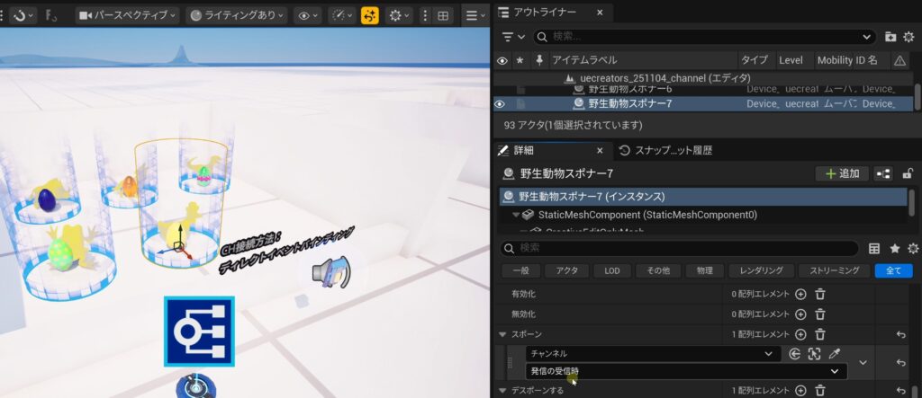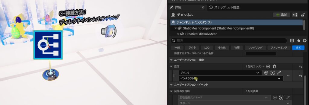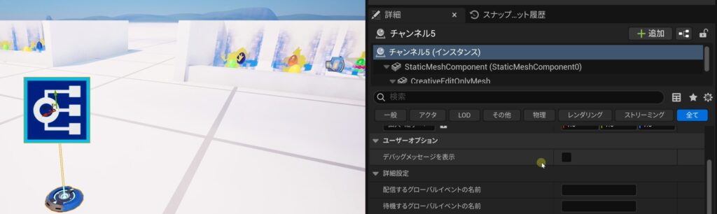 - 詳細パネルの「ユーザーオプション」にある「デバッグメッセージを表示」をTrueにすると、テストプレイ時に通知が表示されるようになります。名前を変更しておくと(例:Channel_Spawnなど)、どのチャンネルが起動したか分かりやすくなります。
