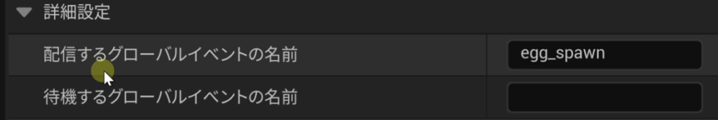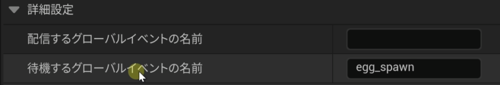 - 送信側のチャンネル 「配信するグローバルイベントの名前」に、任意のテキスト(例:egg_spawn)を入力します。このチャンネルが起動すると、このキーワードの信号が全体に発信されます。