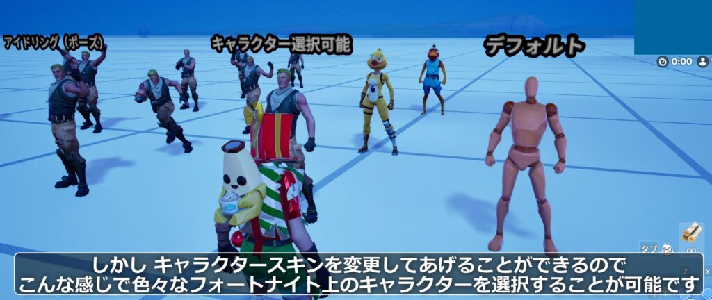 キャラクターの見た目(スキン)は、フォートナイトに登場する数百種類におよぶコスチュームから選択が可能です。