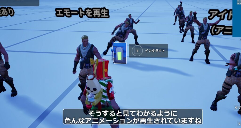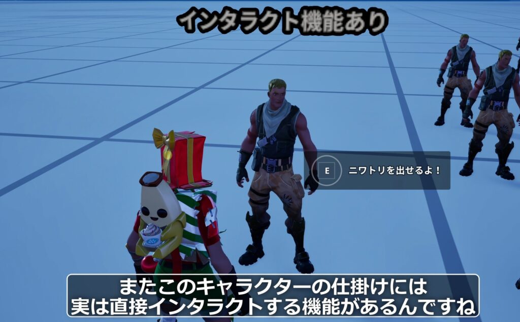 この仕掛けの強みは、なんといっても充実したキャラクタースキンの量と、標準搭載された話しかける機能(インタラクト)です。これらを使うことで、RPGのようなゲームの世界観を比較的簡単に実装することができます。