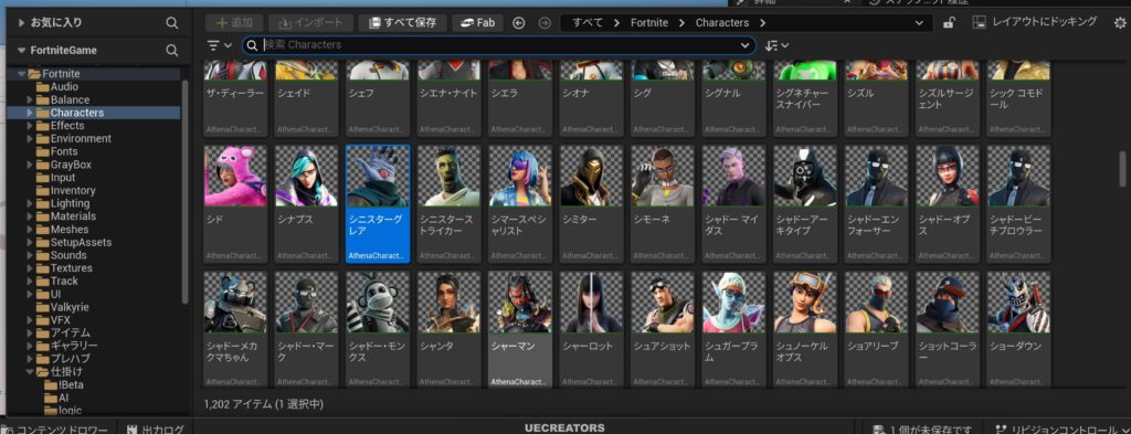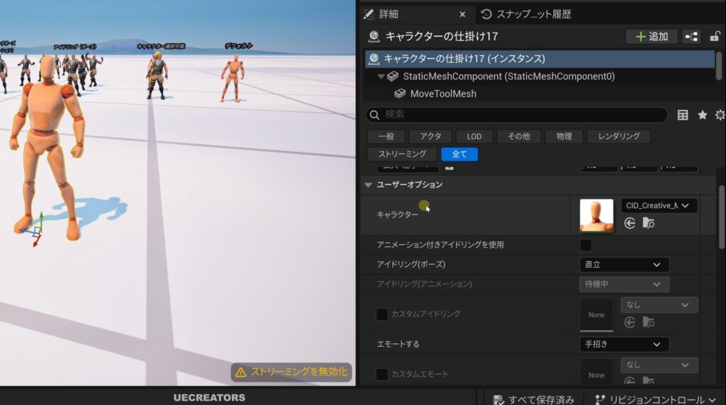 ドロップダウンから選ぶこともできますが、コンテンツブラウザー > Characters フォルダを開き、そこから好きなキャラクターをドラッグして、詳細パネルの「キャラクター」の項目へドロップするのが効率的です。