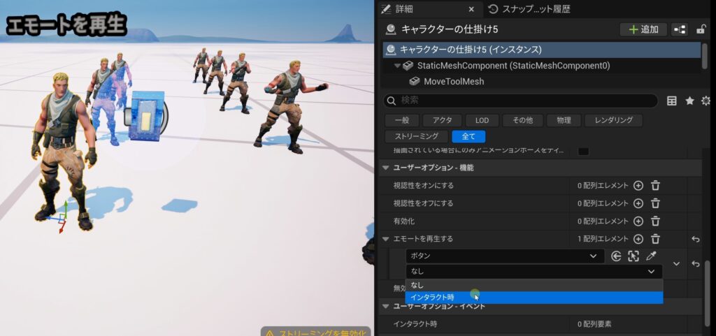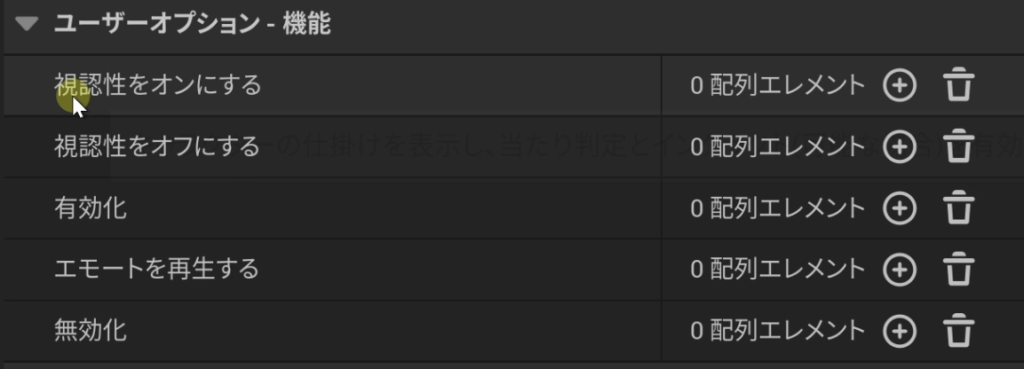 - 詳細パネルの「ユーザーオプション機能」にある「エモートを再生する」の横の「+」(要素を追加)を押します。
