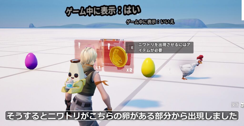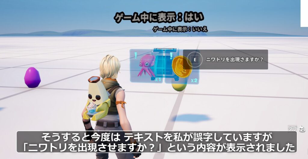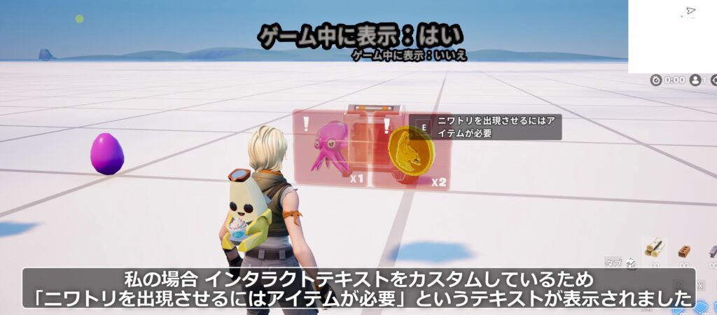 必要なアイテムをすべて獲得した状態で再び条件付きボタンに近づくと、インタラクトテキストが変化します。例では「ニワトリを出現させますか?」という内容に切り替わりました。