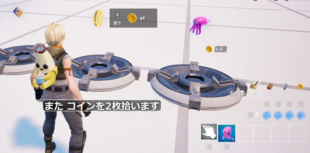 では、必要なアイテム(タコのアイテム1つとコイン2枚)を拾ってみます。
