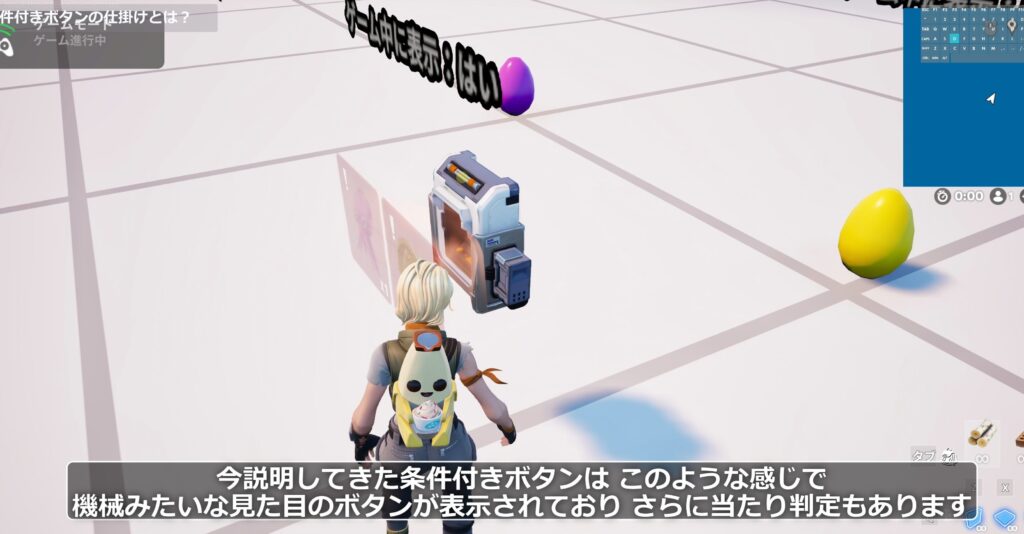 デフォルト設定の「はい」の場合、動画で見てきたような機械っぽい見た目のボタン本体がゲーム上に表示されます。この本体には当たり判定もあります。