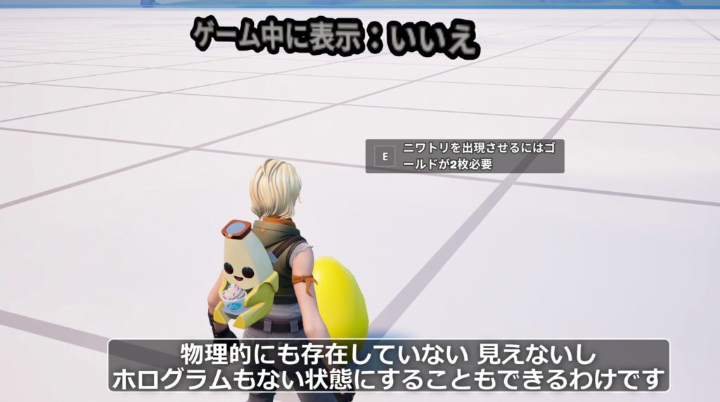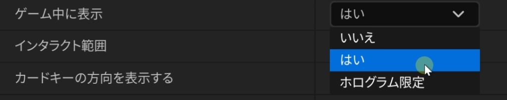 さらに「いいえ」に変更すると、本体もホログラムも完全に非表示になります。しかし、非表示の状態でもインタラクトテキストは表示させることが可能です。