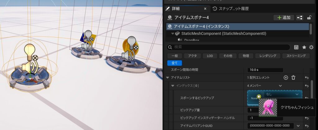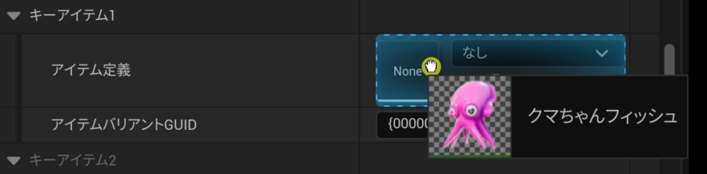 詳細パネルの「キーアイテム1」などの項目に、コンテンツブラウザーの「アイテム」フォルダーから使いたいアイテム(例:くまちゃんフィッシュ)をドラッグ&ドロップします。