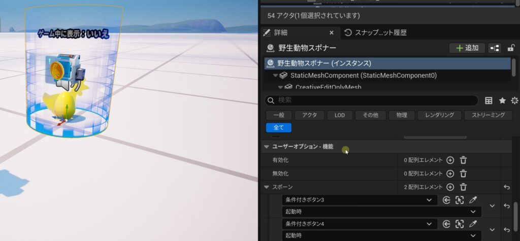 そこに要素を追加し、スポイトマークで連携させたい「条件付きボタン」をレベル上で選択します。そして、イベントのドロップダウン(「なし」と表示されている部分)から「起動時」を選択します。これで、条件付きボタンが起動した時に、野生動物スポナーが起動(スポーン)するようになります。