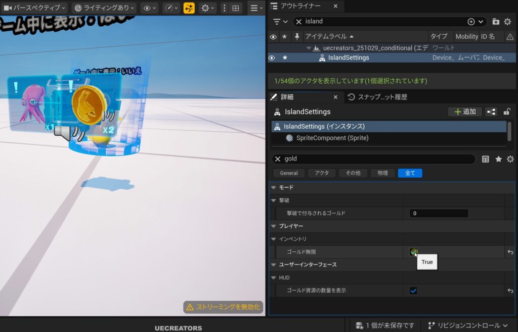 - ゴールド資源の数量を表示:こちらをtrue(オン)にしておくことをお勧めします。プレイヤーの画面(HUD)に、現在所持しているゴールドの数量が表示されるようになります。