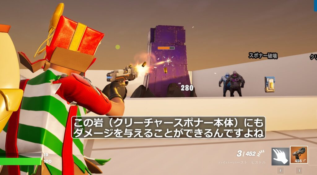 クリーチャースポナーの面白い特徴として、スポナー本体(岩)にプレイヤーがダメージを与えて破壊できる点があります。 スポナー本体を破壊し終えると、そのスポナーからはクリーチャーが一切出現しなくなります。 これはスポーン上限を無限に設定していても同様で、本体を破壊すればクリーチャーの出現を止めることができます。