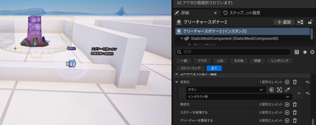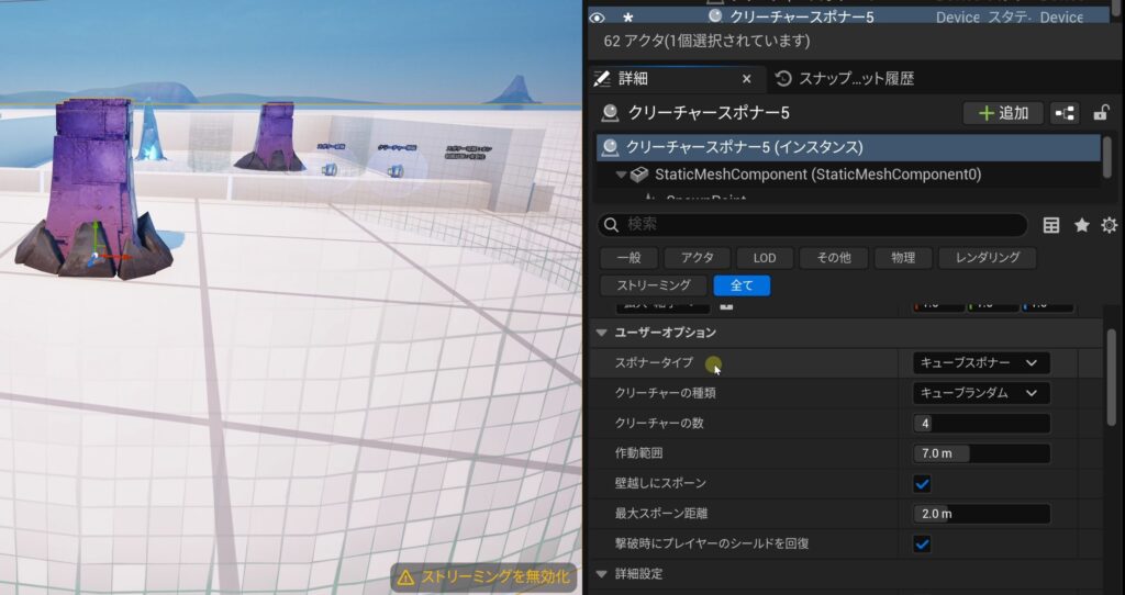 - ゲーム開始時に有効化: デフォルト(True)ではゲーム開始と同時にスポナーが動作します。 Falseにすると、後述する「有効化」イベントが実行されるまでクリーチャーは出現しません。