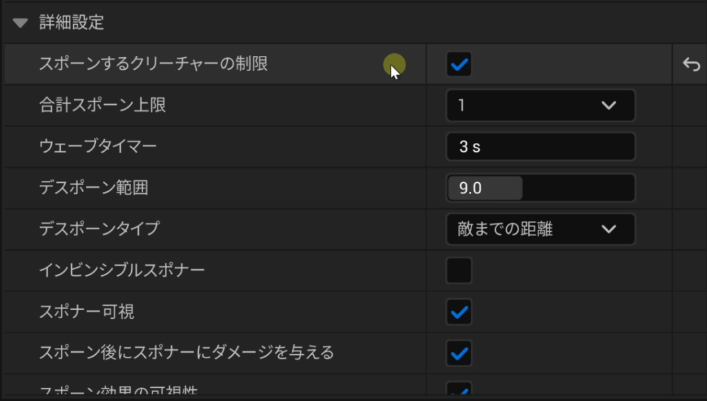 - 壁越しにスポーン: デフォルト(True)では壁を無視してスポーンします。 意図しない場所にクリーチャーが出現するのを防ぎたい場合はFalseに変更します。