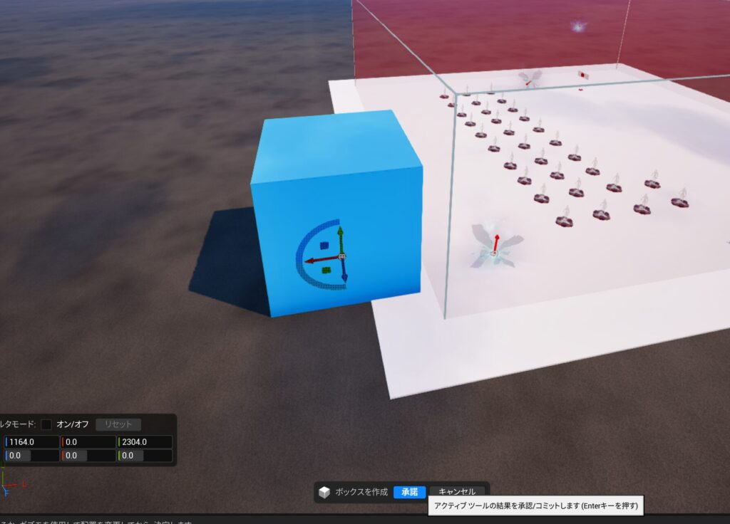 あとは通常通りの操作でトランスフォームの大きさを調節し、対象の空間をボックス(Box)または、球体(Sphere)で覆ってしまえば完成です。覆った範囲内から見る景色を、好きなマテリアルで満たすことができます。いわゆるスカイボックス(Skybox)の完成です。