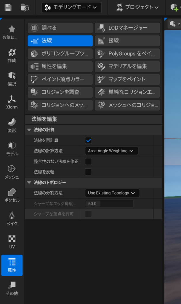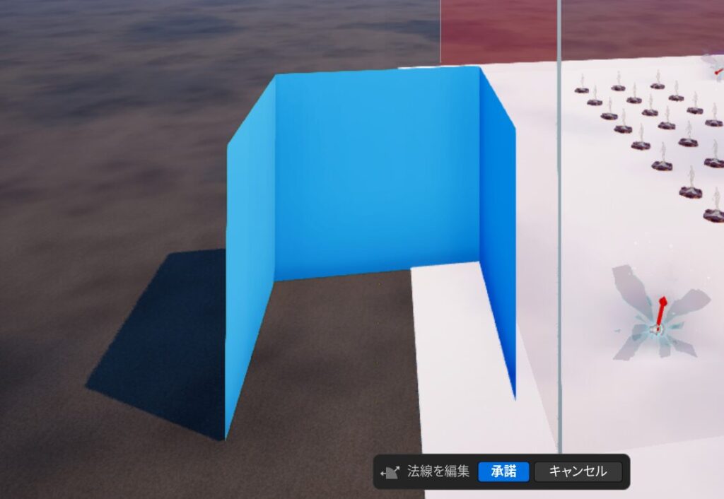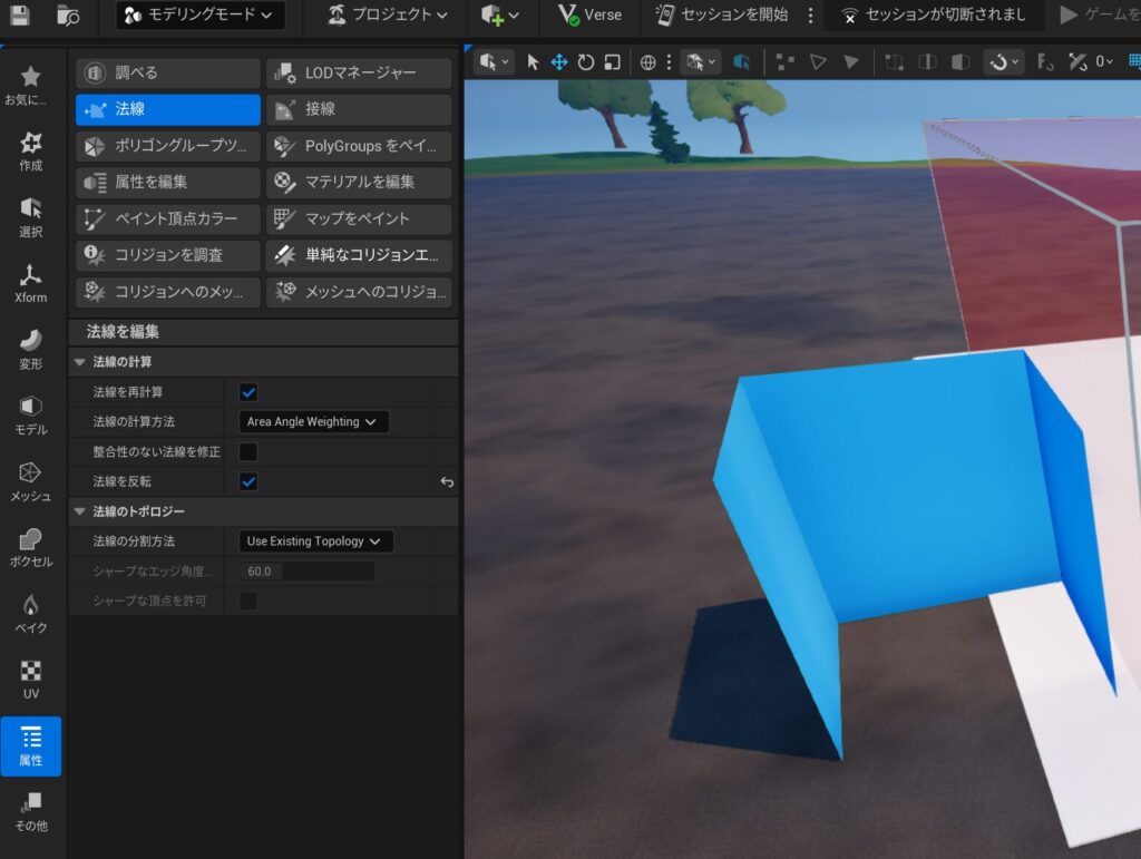 続けて配置したオブジェクトを選択したままの状態で「属性」タブを選択。続けて「法線を選択すると「法線を編集」という項目が出てきます。