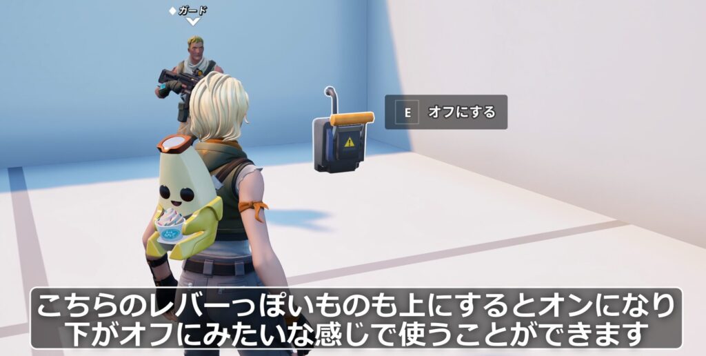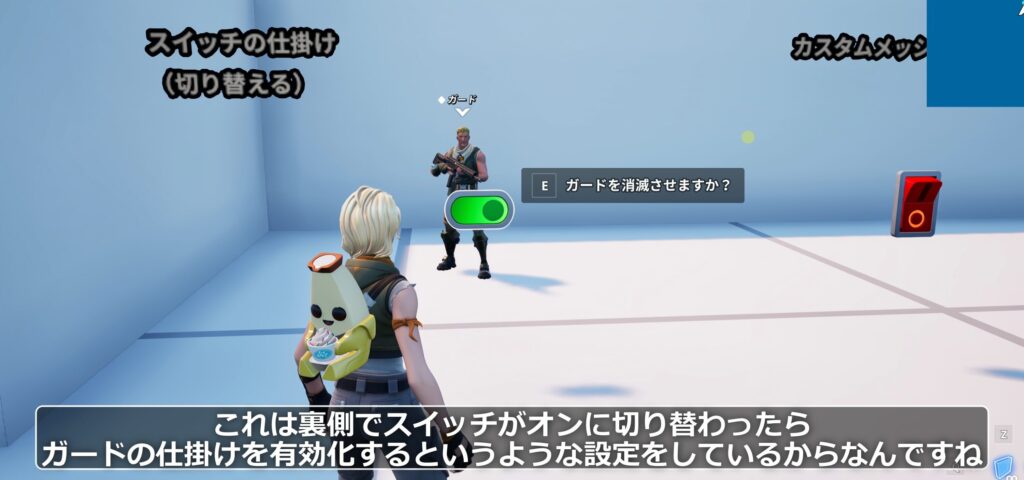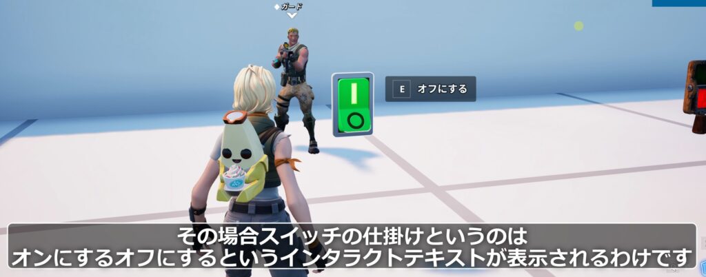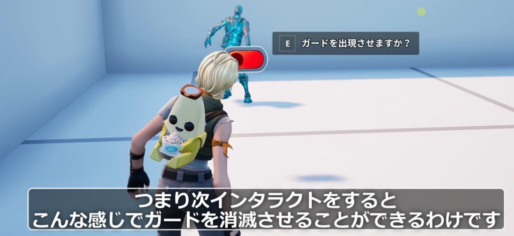 オンの状態でもう一度近づくと、今度はオフに切り替えるためのテキスト(例:「ガードを消滅させますか」)が表示されます。これをインタラクトすると、スイッチが「オフ」に戻り、ガードが消滅(無効化)されます。