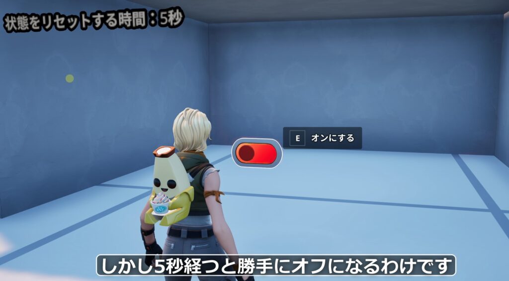 例えば、この時間を「5秒」に設定すると、スイッチをオンにしても、5秒後には自動的にオフの状態に戻ります。