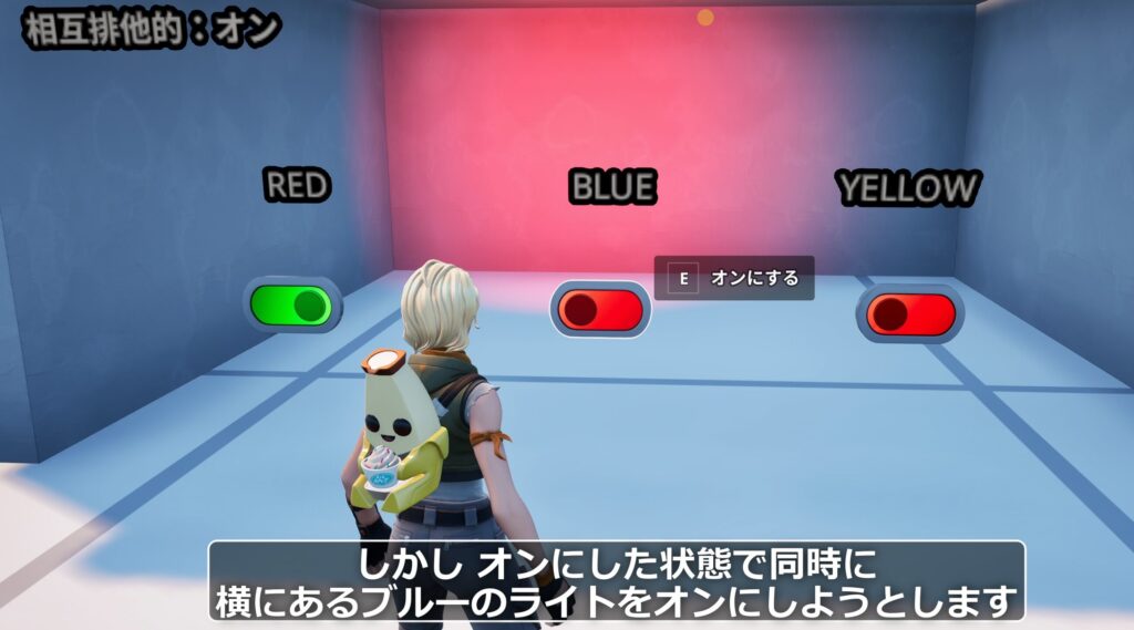 - この時、「相互排他的」機能により、グループ内の他のスイッチ(この場合は「レッド」)が自動的にオフに切り替わります。
