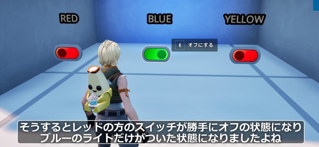 - 次に「ブルー」のスイッチをオンにすると、青いライトが点灯します。