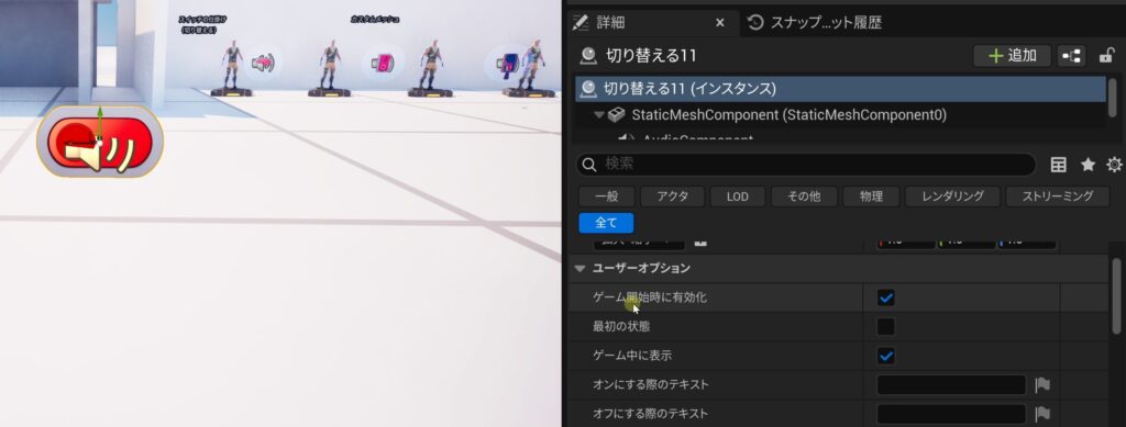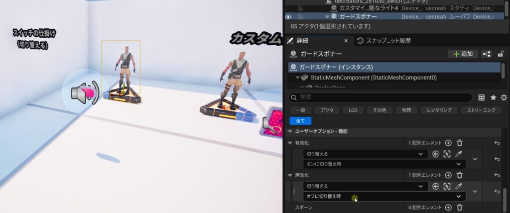 ここからは、スイッチの仕掛けをレベルに配置し、詳細パネルの「ユーザーオプション」で設定する方法を解説します。