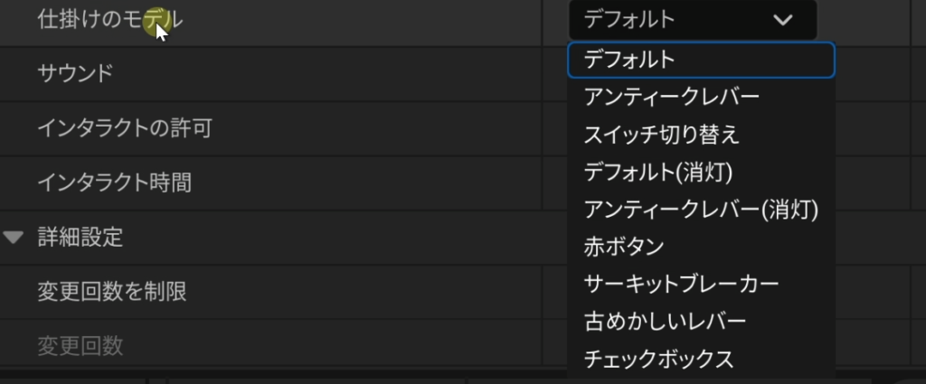 - 仕掛けのモデル: ここで見た目(カスタムメッシュ)を選択できます。「アンティークレバー」「赤ボタン」「サーキットブレーカー」「チェックボックス」など、様々な種類が用意されています。