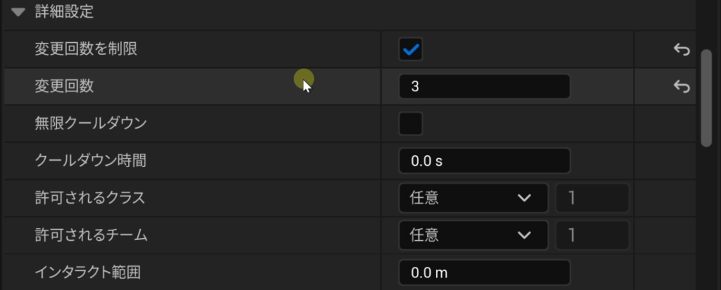 - インタラクト範囲: スイッチを操作できる距離の範囲を設定します。