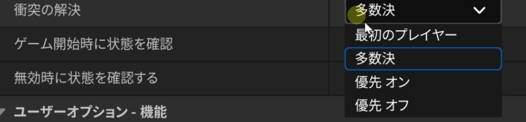 全員で共有するスイッチ(例:マップのボスを倒したかどうか)の状態をセーブした後、後日、別々のプレイヤーが同じセッションに集まった時、「ボスの状態は倒した状態にすべきか? それとも倒す前の状態にすべきか?」という問題(衝突)が発生します。 それを解決するためのルールが「衝突の解決」です。
