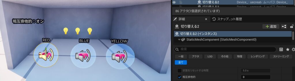 - 3つのスイッチを配置し、それぞれの「相互排他」をオンにして、「インデックス値」をすべて同じ番号(例:0)に設定します。