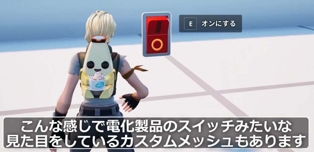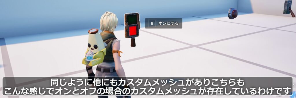 これらのカスタムメッシュも、オンとオフの状態で見た目が切り替わります。ゲームの雰囲気に合わせて使い分けることができます。