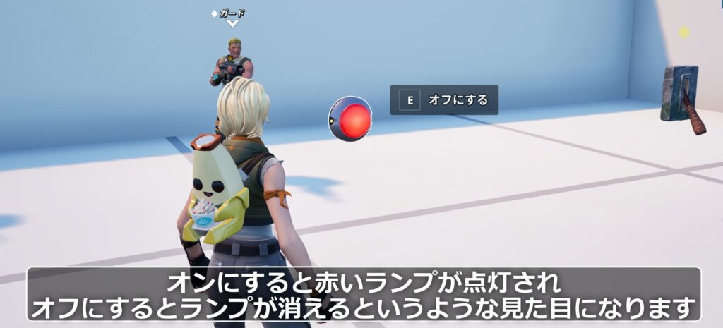 まず、最も標準的なスイッチです。デフォルトの状態では、スイッチは「オフ」になっており、見た目は赤色です。近づくとインタラクトテキスト(例:「ガードを出現させますか」)が表示されます。