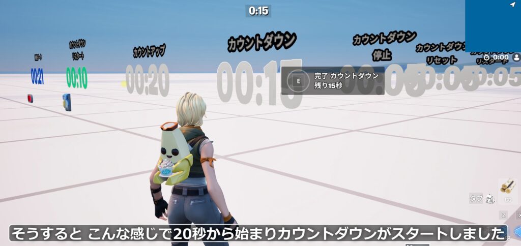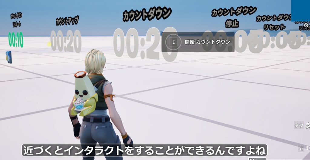 例えば20秒に設定した場合、インタラクトすると20秒からカウントダウンが開始されます。タイマーの時間はプレイヤーの画面(HUD)にも表示させることができます。