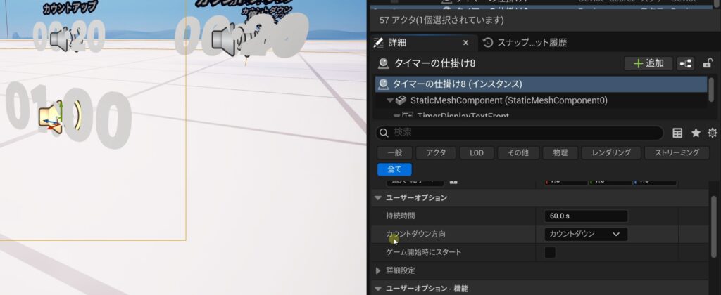 タイマーの仕掛けをレベルに配置し、詳細パネルから設定できる主な項目を解説します。