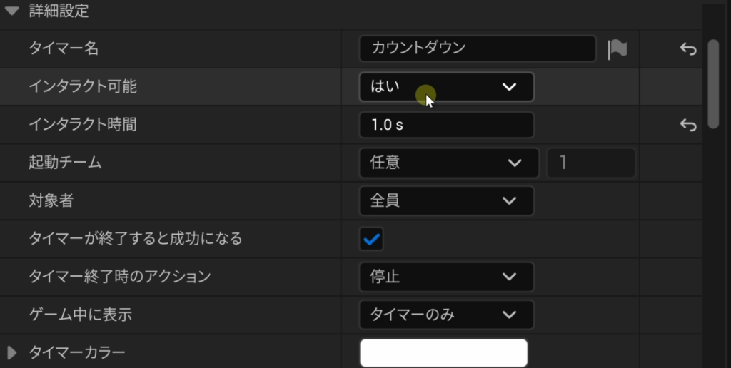 - インタラクト可能: プレイヤーが直接タイマーを操作できるかを設定します(はい / いいえ / 開始のみ / 完了のみ)。